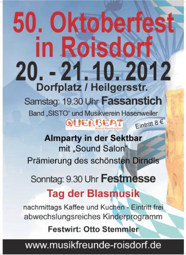1962 wurde dann das erste Roisdorfer Oktoberfest durchgeführt. Das seitdem jährlich stattfindende Fest entwickelte sich schnell zu einem der geselligen Höhepunkte im Vorgebirge und ist seitdem nicht mehr aus dem Roisdorfer Veranstaltungskalender wegzudenken.